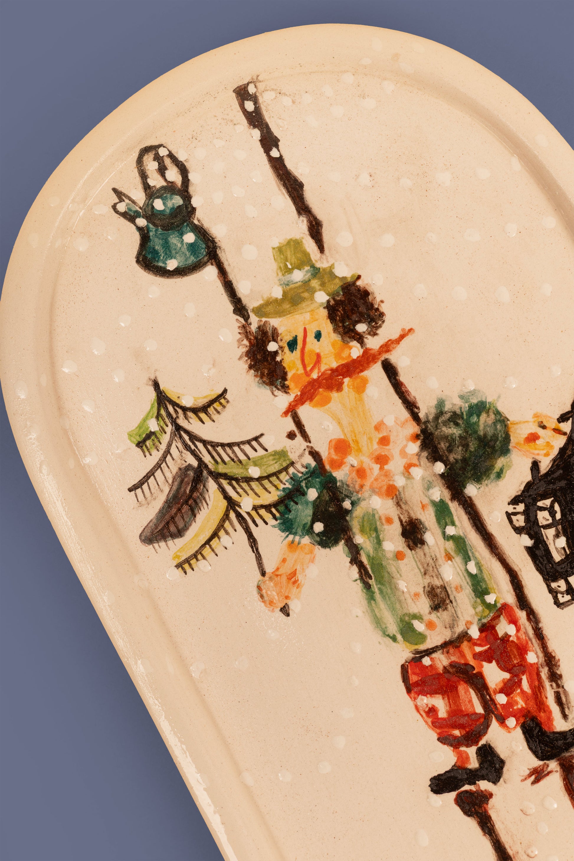 Hans is the son of Oberconducteur Trifon Amkholadze's first wife, Chitolia. Chitolia was a different kind of woman, a trendsetter - she ate cherries with a needle in the window and smelled of a broom's perfume. Later, she married Otto Veitzeker and had children with him, a girl and a boy—Hans and Tsiala. This plate embodies the charm and imagination of Gabriadze’s literary universe.