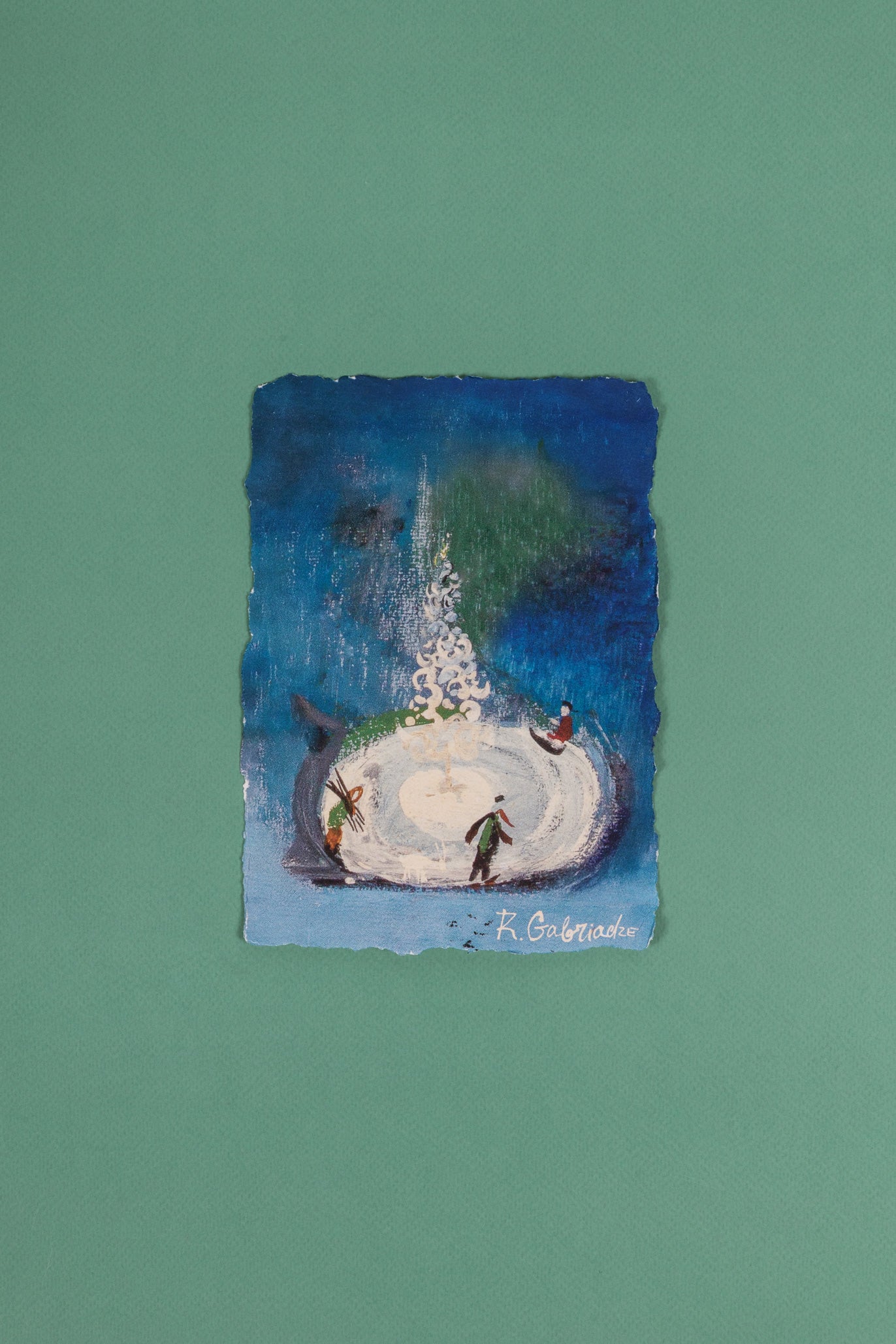 Featuring Rezo Gabriadze’s painting of a winter scene, this postcard captures the warmth and quiet magic of Christmas.
