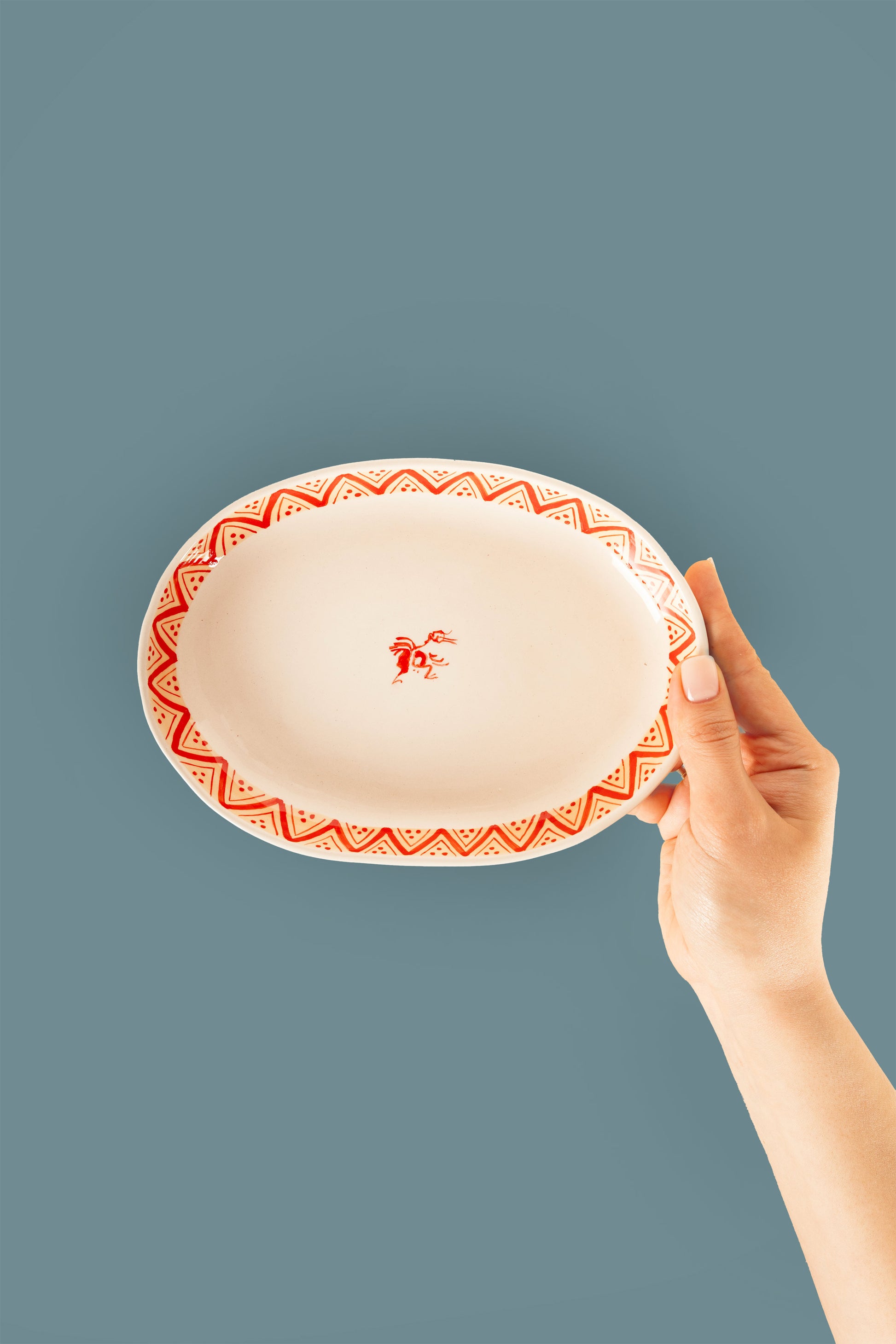 This small oval plate highlights a striking red geometric design. Part of the Ornaments Collection, it’s a compact yet bold addition that pairs beautifully with other collection pieces for a cohesive look.